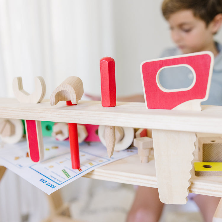 - Kid-sized workbench includes a functioning vise, tool rack, wooden tools, and hardware