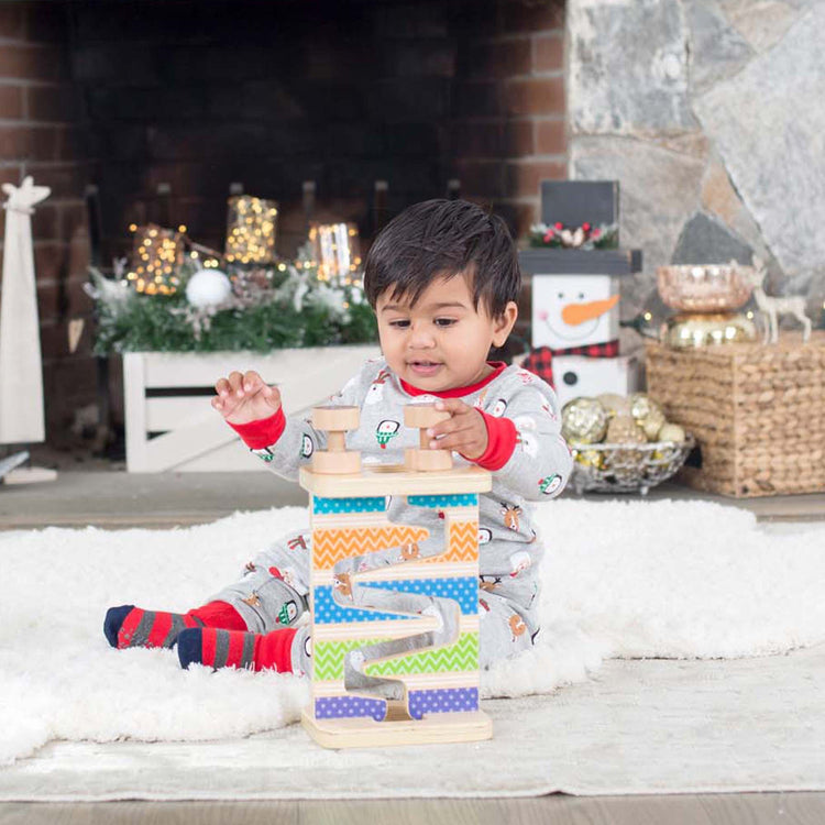 - Includes tower and four solid wood pieces to roll down the track