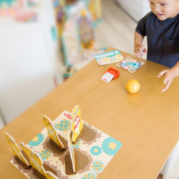 - Use the game spinner and try to knock down matching numbers, or play traditional bowling games; a fun introduction to cause-and-effect and great for learning numbers, matching, counting, and encourages problem-solving and motor skills